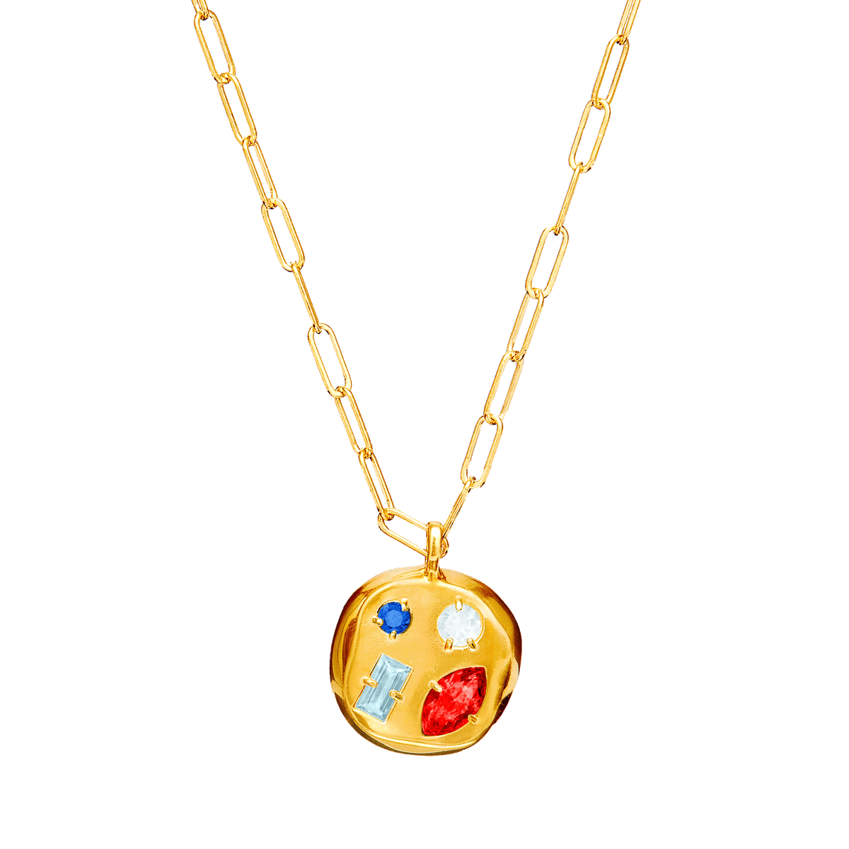 The pendant is made from brass with electroplated 14-karat gold.