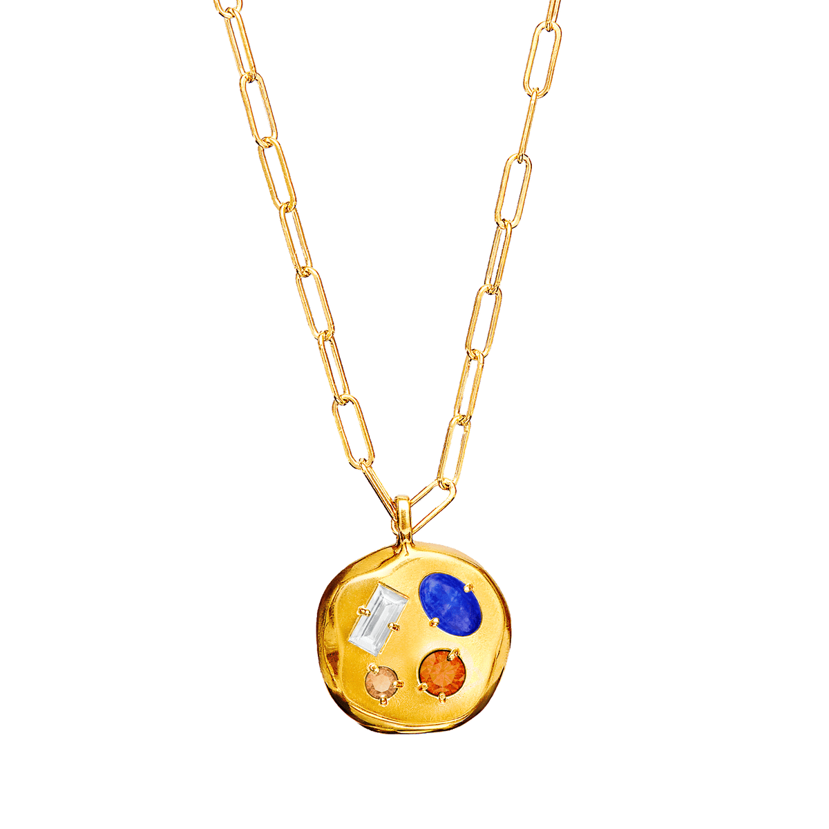 The pendant is made from brass with electroplated 14-karat gold.