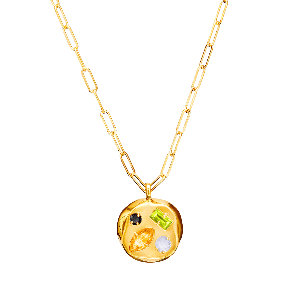 The pendant is made from brass with electroplated 14-karat gold.