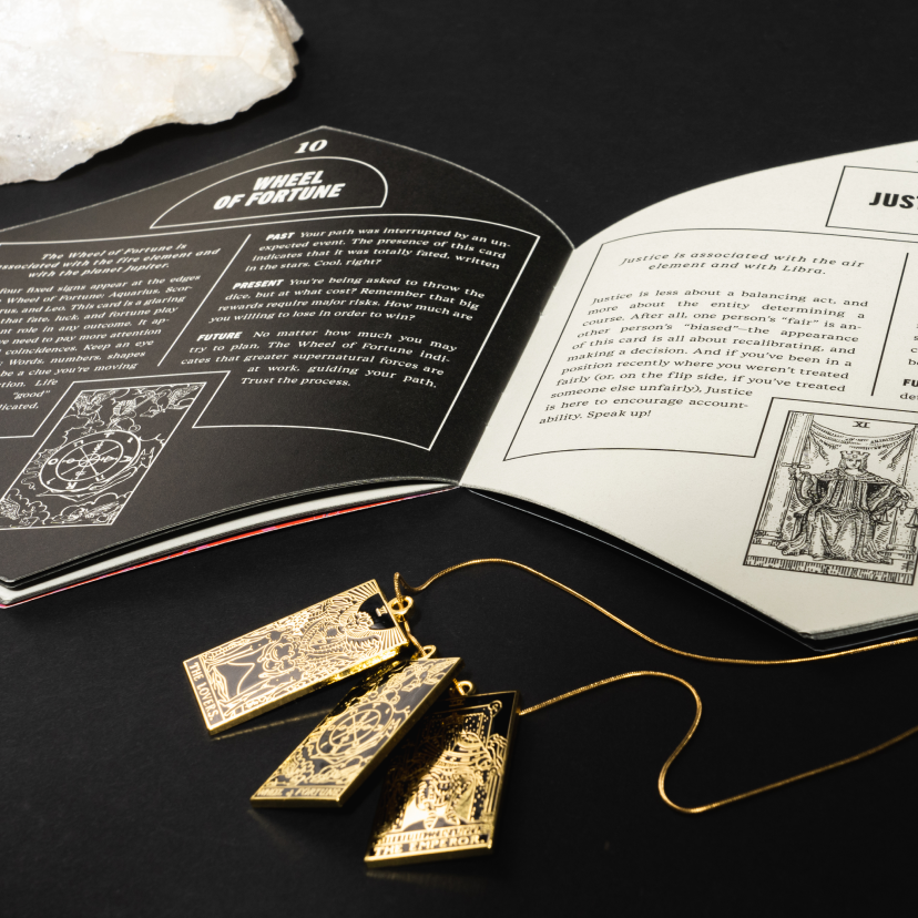 Each Tarot Charm is gold-plated, hand-filled with enamel, and doubles as a pendant—so your reading isn’t just a moment, it’s a keepsake! With 22 unique designs inspired by the Major Arcana, your charm is a little piece of tarot magic you can wear forever.